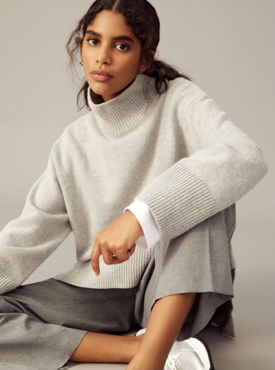For those brisk spring mornings, a cream knit turtleneck with linen trousers offers the perfect balance of warmth and lightness. Oversized yet structured, this outfit exudes effortless elegance and makes a smooth transition from winter. The soft neutrals and playful accessories like tassel earrings make it a versatile choice for everything from morning meetings to weekend coffee runs.