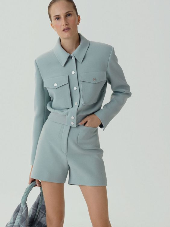 Soft pastels redefine power dressing in spring 2025. A sky-blue button-up shirt and coordinating tailored shorts deliver a fresh take on workwear. This look is perfect for warmer office days or stylish client meetings, offering a blend of function and femininity. With subtle European elegance, this outfit captures the modern woman’s ability to command a room with softness and strength.