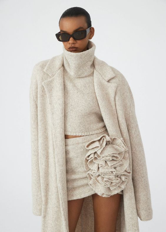 Knitwear transforms into fashion art with this sculptural cream ensemble. A high turtleneck and dramatic waist detailing elevate the look from simple to standout. This bold outfit redefines spring fashion for women over 40, merging comfort with confidence in a work-ready or weekend-ready piece that commands attention.