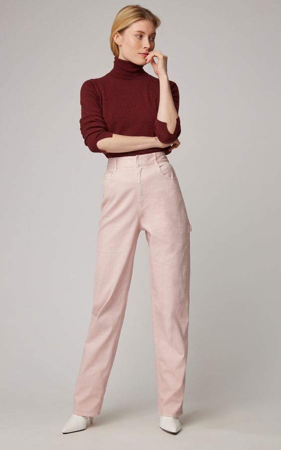 Contrast creates visual interest, and this outfit makes it artful. A plush burgundy turtleneck pairs beautifully with soft pink trousers for a look that’s both warm and spring-ready. This pairing subtly nods to Western influences while offering a unique twist for women over 40 who want to keep their wardrobe fresh yet classic.