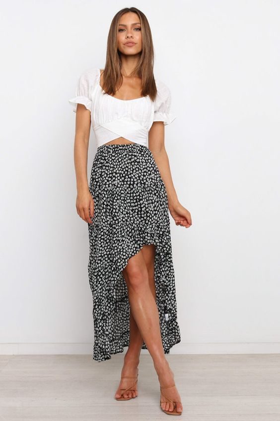 Floral midi skirts are reimagined with asymmetry in a high-low hemline that feels both airy and intentional. Styled with a white crop top, the skirt’s delicate print and flowing shape make it a standout for outdoor festivals, garden dates, or relaxed weekend adventures.