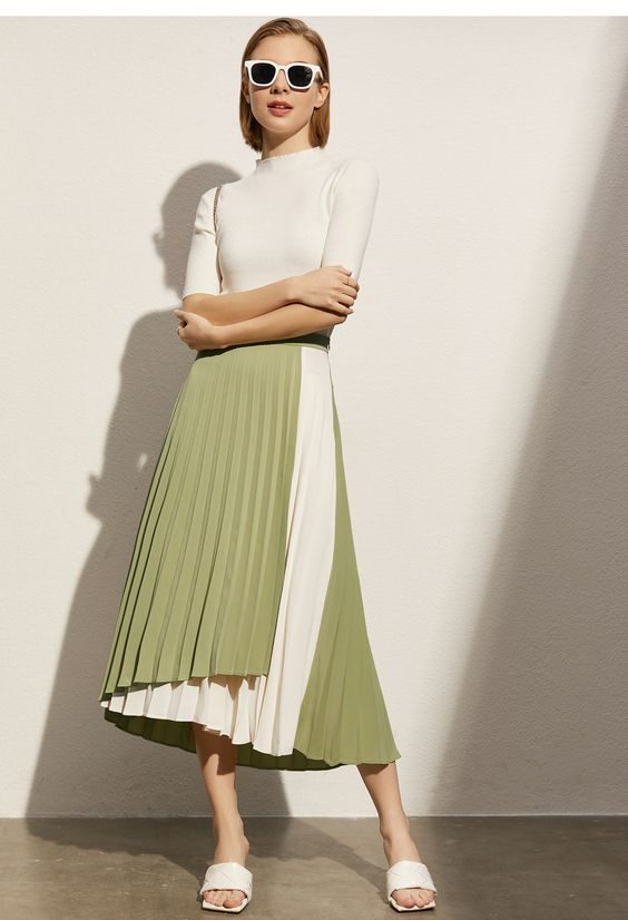 Color-blocking meets classic pleats in this olive and white midi skirt. The fresh palette and timeless structure deliver a sophisticated statement without effort. This outfit is ideal for museum strolls, stylish commutes, or relaxed city brunches—elegant yet approachable.