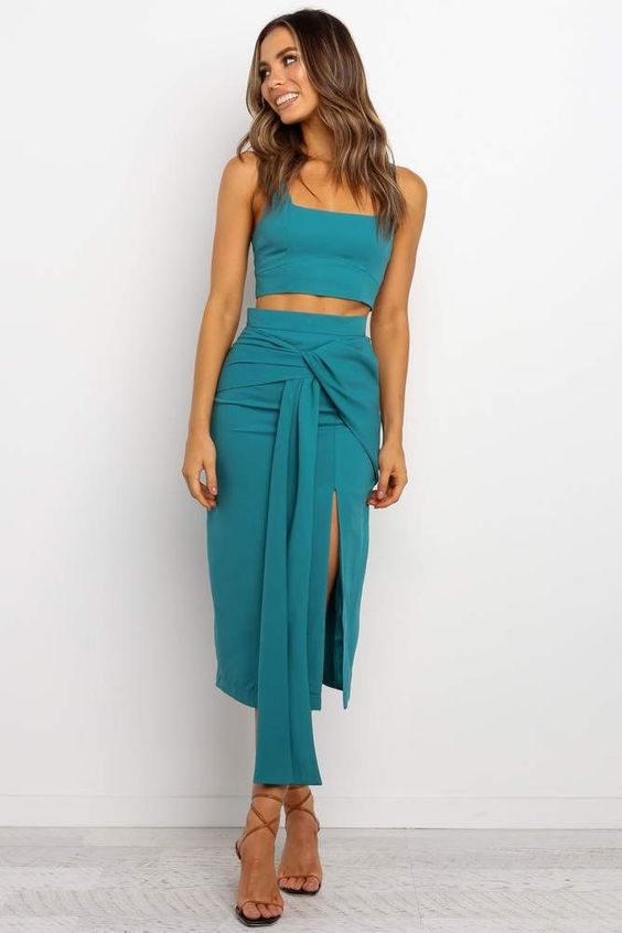 A teal satin wrap skirt brings fluid motion and versatility to warm-weather dressing. The adjustable waist and sultry side slit create a relaxed yet elevated silhouette. Worn with a matching crop top, it becomes a monochrome dream—equal parts laid-back and luxe. Ideal for garden parties or elegant outdoor dinners.