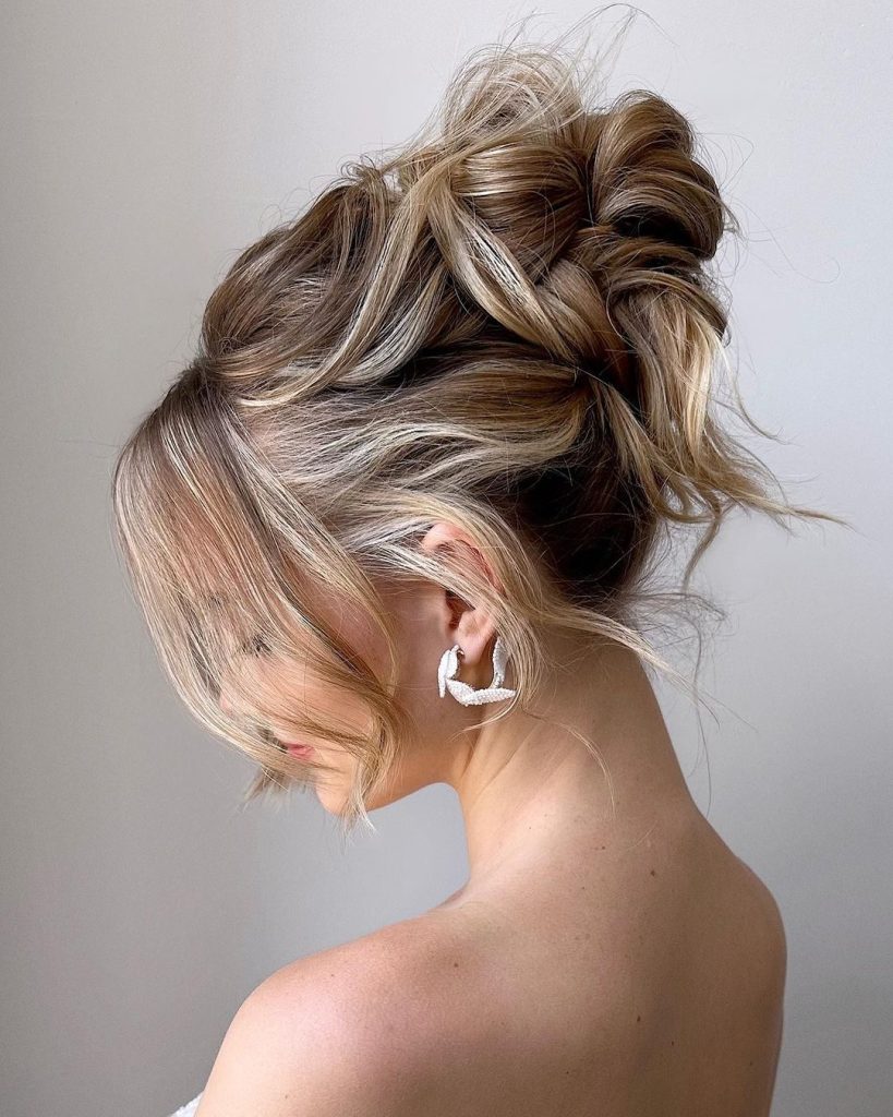 For brides and romantic souls, the disheveled blonde updo is pure perfection. Soft tendrils frame the face while the rest of the hair is swept into a loose, airy bun. Ashy blonde tones catch the light beautifully, giving the hair a dreamy, ethereal glow.