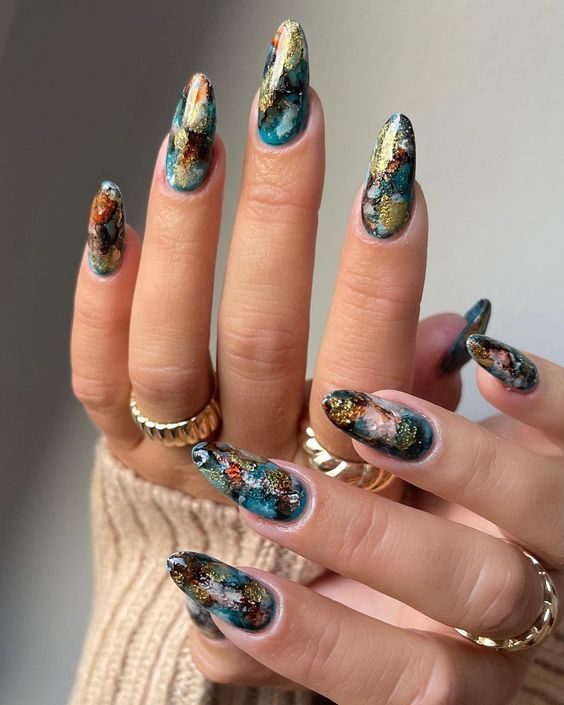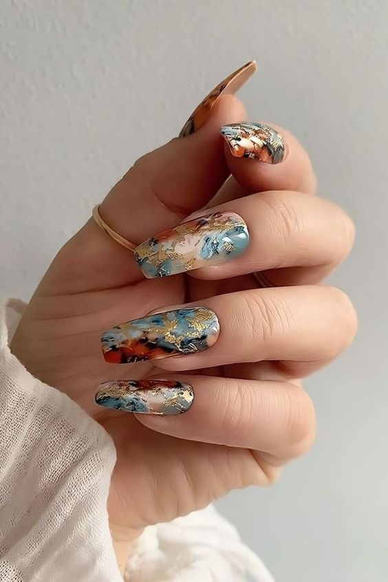 Turn your nails into miniature masterpieces with this abstract blend of blue, orange, and gold. Gold foil adds a luxe French accent to the swirling base, creating a striking look for upscale events or summer soirées. A high-fashion favorite, this artful approach to summer nail colors ideas 2025 is ideal for women who love bold sophistication.