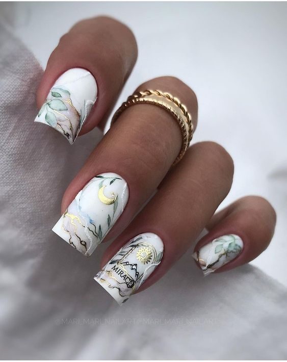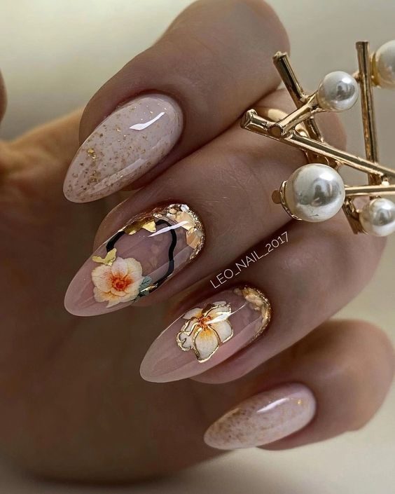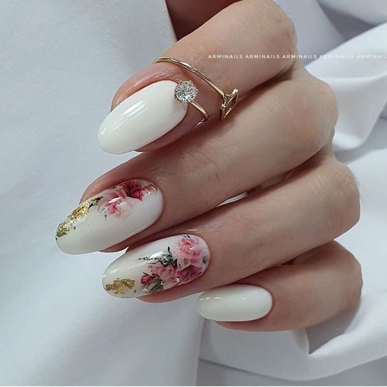 Inspired by nature’s softest blooms, this summer design reimagines the French tip with delicate florals. A crisp white base blends into soft pink, while gold foil accents elevate the almond shape into wearable art. Whether on short or long nails, this look transforms nail color into a poetic fashion statement, making it a must-have in the summer nail colors ideas 2025 for women who adore elegance with a romantic twist.