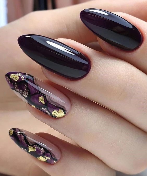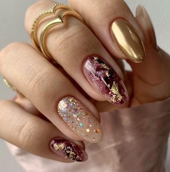 Mysterious and moody, this design celebrates the bold beauty of burgundy with gold leaf detailing and textured finishes. Especially striking on dark skin, it adds depth and allure to summer nail colors ideas 2025 while maintaining a refined simplicity that transitions seamlessly from day to night.
