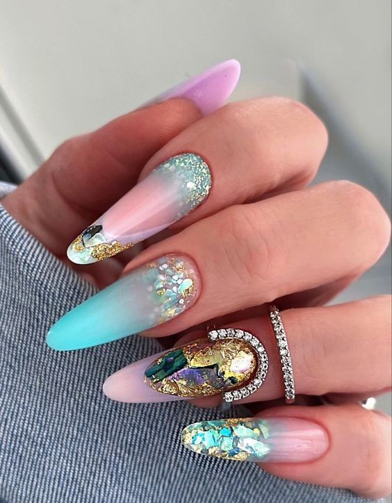 This design is a luminous reflection of summer’s aquatic beauty. A gradient transition from lavender to light blue, sprinkled with glitter, captures the shimmering ocean under sunlight. Gold leaf accents dance across the ombre base, evoking the hidden treasures of the sea. Perfect for bright acrylic nails on dark skin, this look is for those who carry the soul of the ocean in every detail of their summer nail colors ideas 2025.
