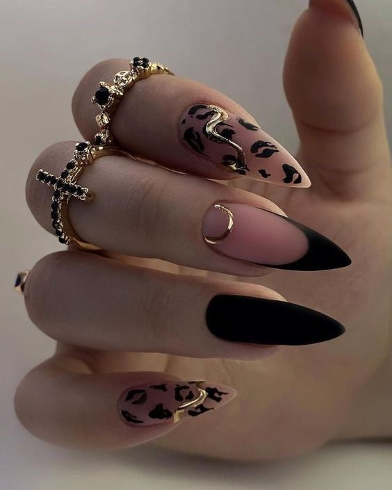 Reinvent the classic French manicure with a bold black twist. Jet-black tips meet a soft pink base, while animal print accents bring a wild edge to the refined almond shape. Perfect for those who balance daring flair with natural polish, this chic design adds stylish drama to your summer nail colors ideas 2025.