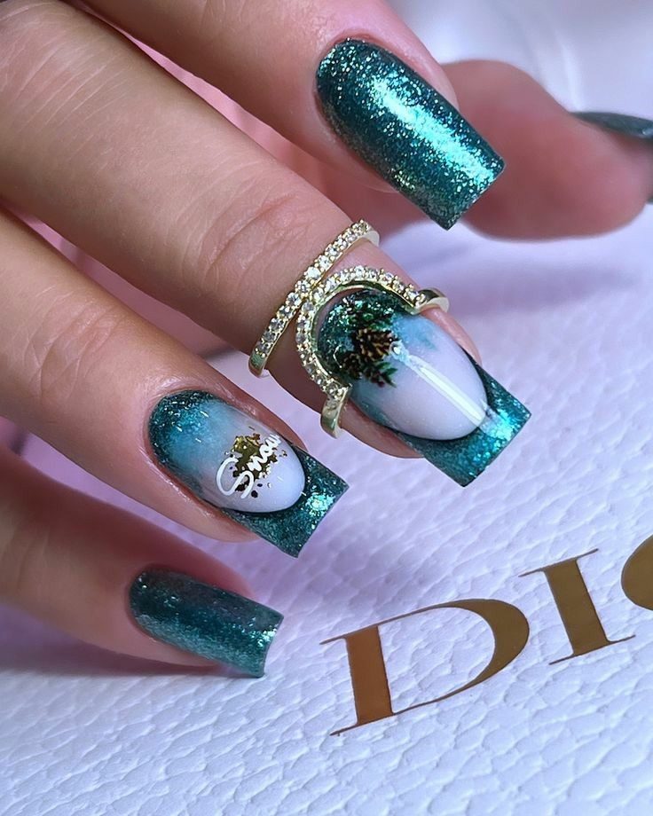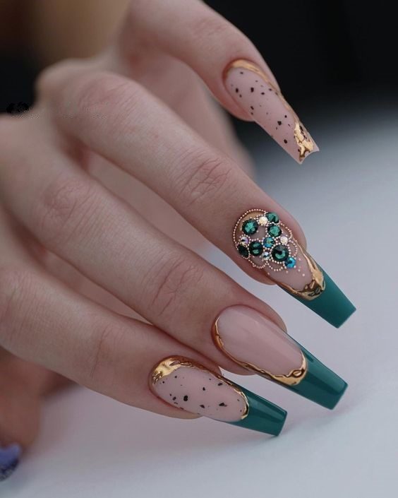 Timeless glamour defines this rich jade design edged with luxurious gold. Its speckled texture and intricate embellishments mirror ancient artifacts, while the almond shape adds vintage appeal. Best suited for light and tan skin, this manicure pairs beautifully with linen dresses and soft summer evenings, bringing a touch of nostalgic drama to your simple natural summer nail colors ideas 2025.