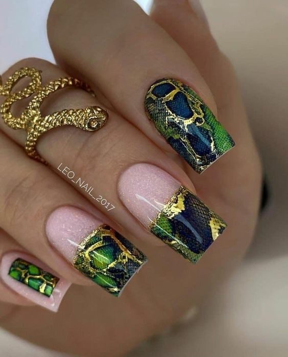 Channel regal power with a design that’s as fierce as it is fashionable. Deep greens and rich blues, accented with golden foil, mimic the mesmerizing texture of reptile scales. This solid gel look offers a dramatic edge that flatters dark skin and demands attention. It’s a commanding entry in summer nail colors ideas 2025 for the bold, unapologetic woman who owns her summer style.