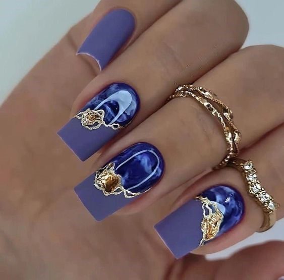 This design blends matte indigo with glossy oceanic swirls, enhanced by gold accents that evoke royalty. The long nail length allows the full effect of the design to shine through, creating a regal presence. For those wanting rich, deep tones in their summer nail colors ideas 2025, this is an opulent and unforgettable choice.