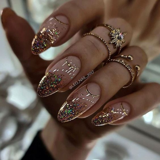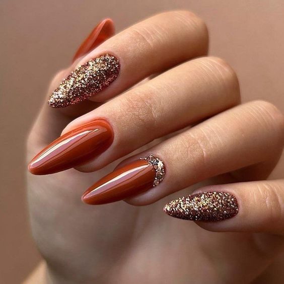 Add a dose of seasonal sparkle with this dazzling design. A rich cinnamon base complements tan skin, while alternating glitter accents enhance its glamorous flair. Long and sculpted, this look blends French elegance with bright acrylic boldness, making it one of the most versatile summer nail colors ideas 2025 for evenings filled with energy and elegance.