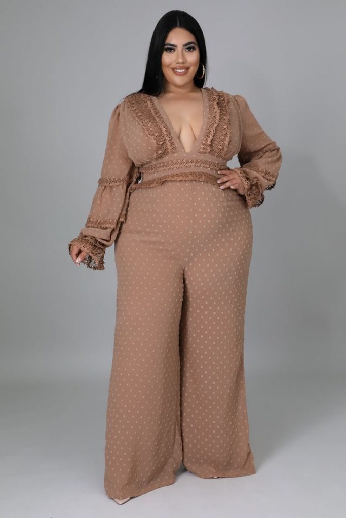 Boho takes a vintage turn with this lace-detailed polka dot jumpsuit. The deep V-neck and wide-leg silhouette are grounded in comfort, while the earthy tones add a timeless, versatile flair. Whether you’re attending a laid-back work event or heading out for tapas, this piece fits beautifully into a capsule wardrobe that prioritizes effortless elegance.