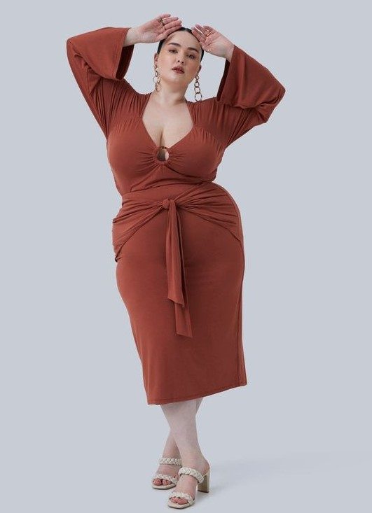 Step into confidence with a plunging neckline dress in rich earthy tones. This piece strikes a harmonious balance between modest elegance and edgy flair, thanks to the waist-cinching tie that creates a flattering silhouette. It’s a go-to for sophisticated over-40 fashionistas building a travel-friendly capsule wardrobe that transitions from daytime chic to evening luxe.