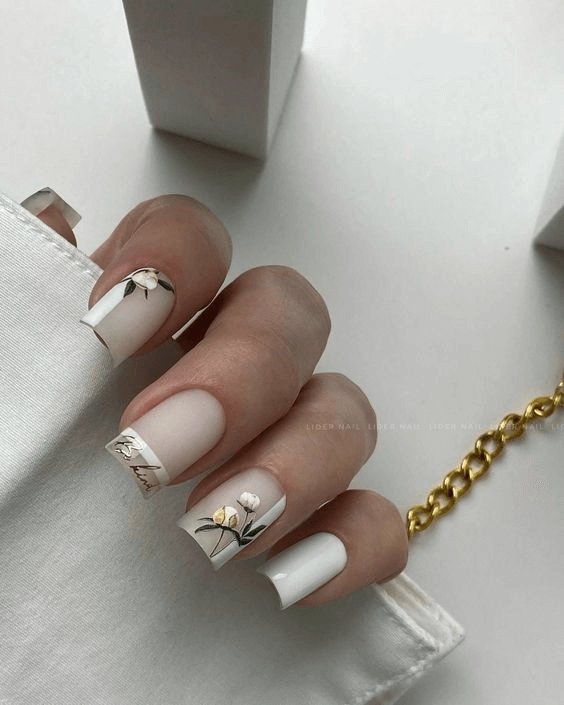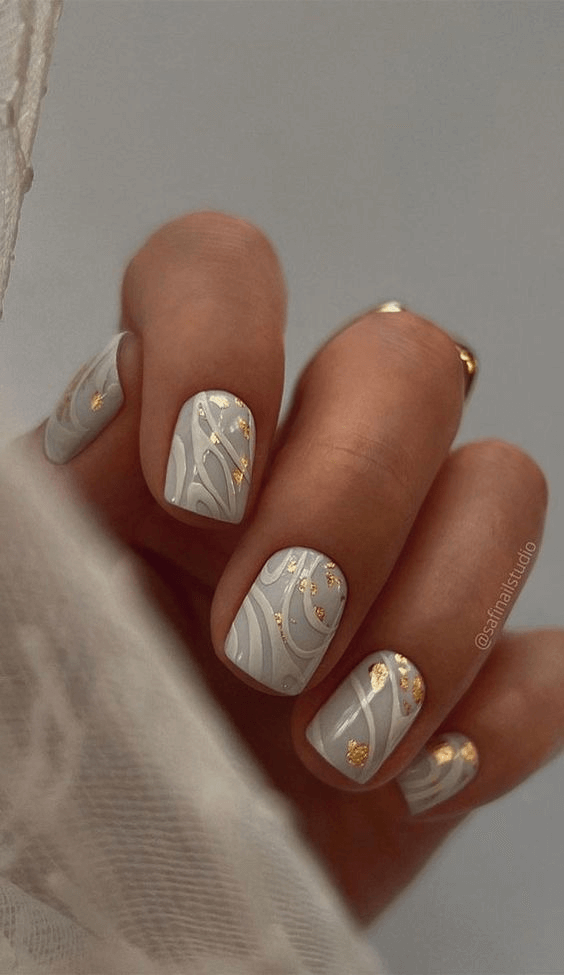 Short nails can absolutely make a statement, especially with delicate white floral patterns and subtle gold accents. This sweet design gives vintage bridal vibes while feeling fresh and modern. It’s a wonderful option if you want your nails to feel decorative but not busy, and it complements dresses with lace or floral embroidery beautifully.