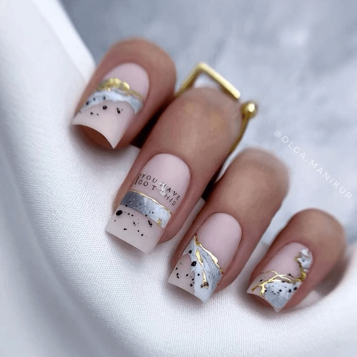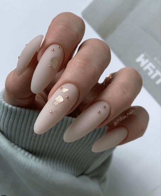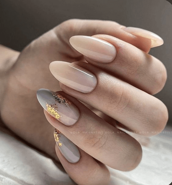 The beauty of this design lies in its subtle layers. Sheer nude tones blend seamlessly with hints of soft gray and gentle touches of gold leaf, adding dimension without overpowering. Oval or almond shapes keep the effect graceful and elongate the fingers. Pair this look with a vintage-inspired gown, romantic curls, or a boho bouquet for a dreamy, timeless vibe.