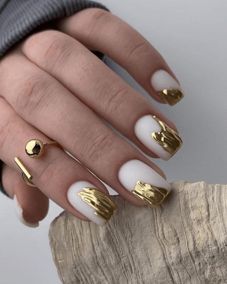 Channel your inner artist with abstract nail art. This design combines tiny gold foil details, hand-painted brush strokes, and speckled dots for a look that’s effortlessly cool. It works well on a modern coffin shape or classic oval. It’s the perfect choice for creative brides who want a manicure that feels personal, unique, and a little playful — all while staying elegant.