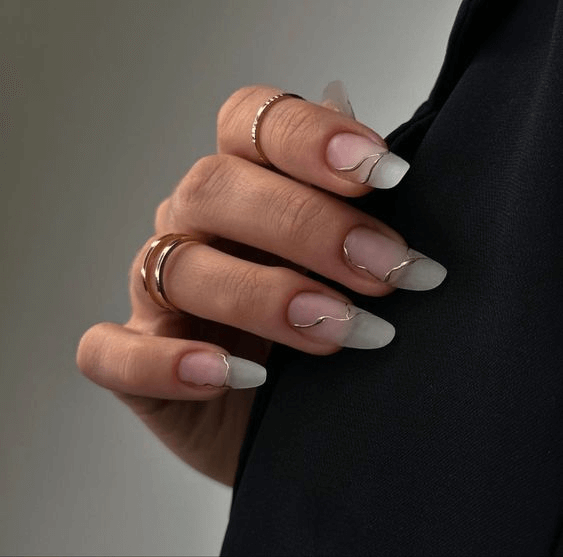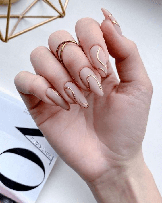 Sometimes, the simplest designs are the most striking. This look features ultra-fine gold lines on a nude or sheer base, adding an elegant, jewelry-like finish. Short almond or square shapes work beautifully here, making the nails feel understated yet special. This style is especially lovely if you’re wearing delicate gold rings or bracelets, tying your manicure seamlessly into your overall look.