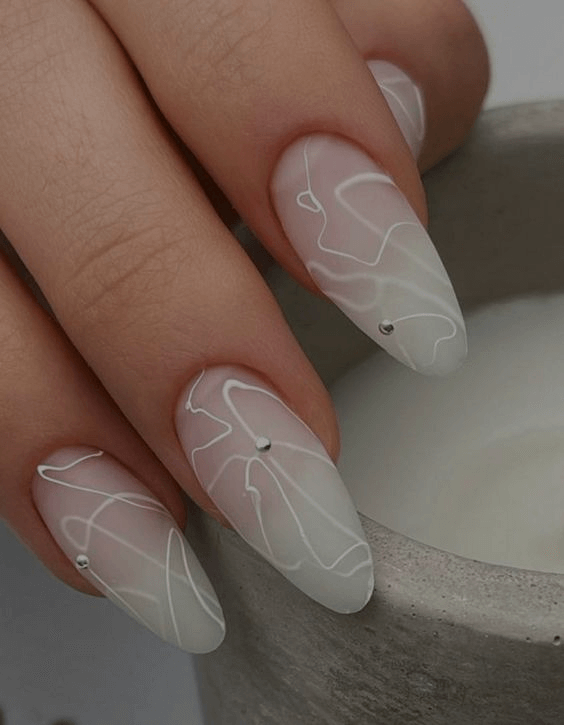 If you’re drawn to luxury finishes, marble nails will steal your heart. A long stiletto or almond shape works best for this look, which combines a soft white base with subtle gray swirls. A single crystal accent on each hand brings an extra touch of bridal sparkle. This design is stunning for formal ceremonies, grand hotel venues, or black-tie weddings where you want your nails to feel like a couture detail.