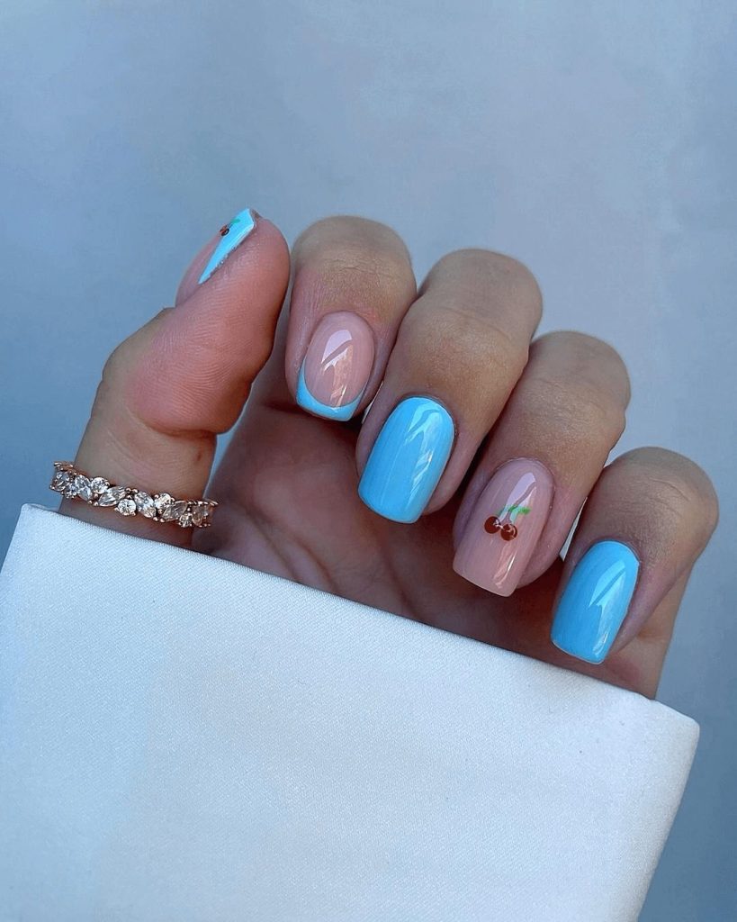 For those who love fresh, cheerful manicures, this design combines playful and preppy vibes. The nails are painted in a soft baby blue reminiscent of clear summer skies, while one accent nail features a charming cherry detail. The simplicity of the base color paired with the whimsical fruit accent makes the overall look sweet, stylish, and effortlessly trendy.