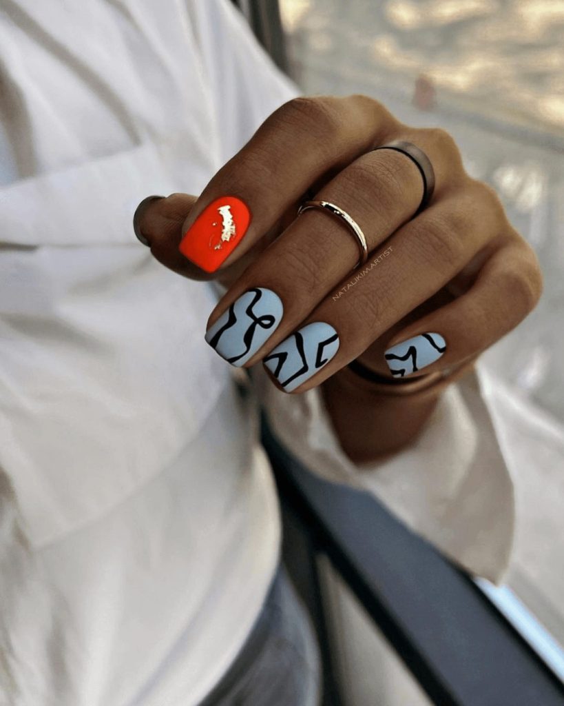 At home, start with a white gel base on all nails. Dedicate one nail for the neon orange accent, then use a fine brush to draw bold black lines and patterns on the remaining nails. Seal everything with a gel top coat to enhance the sharp contrast. This manicure is modern art you can wear.