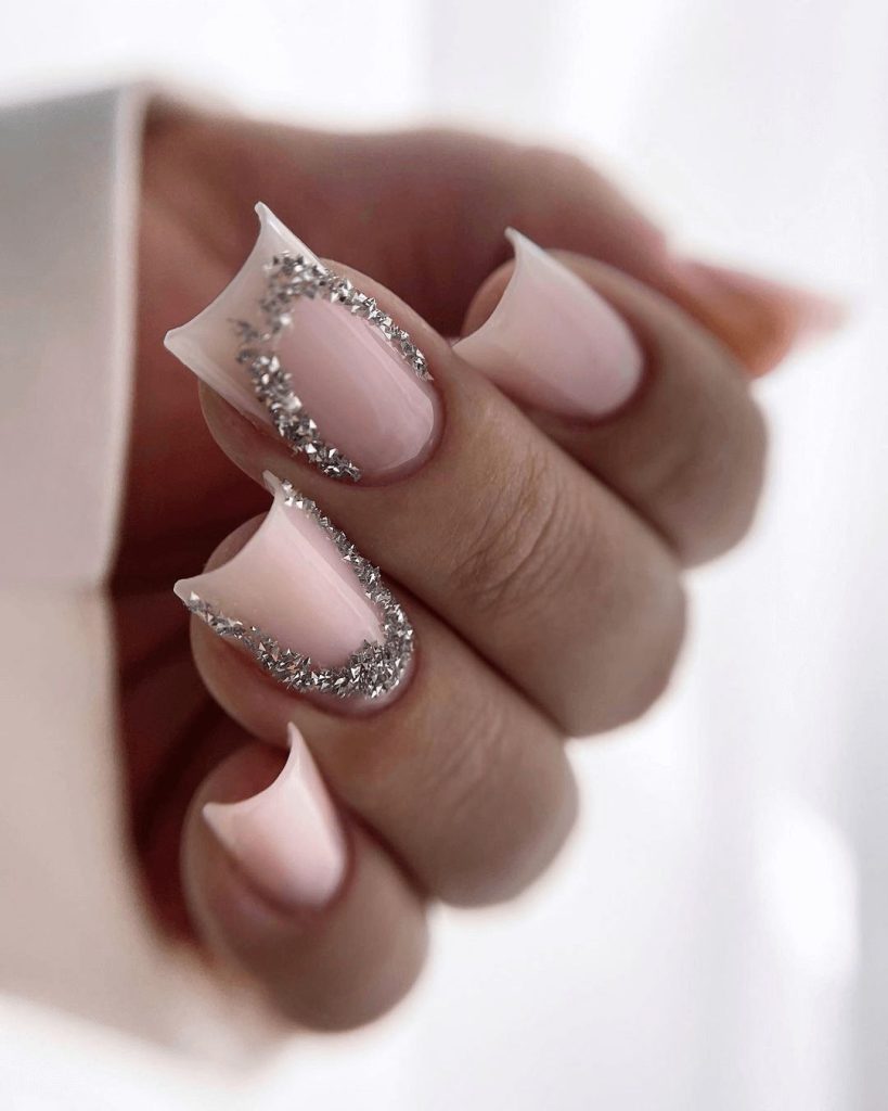 Start with clear gel polish as your base. Sponge on white glitter at the tips, blending upward to create a frosted ombre. Cure and finish with a glossy top coat for a glass-like shine. The result is a shimmering manicure that feels both magical and modern.