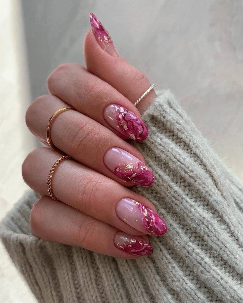 Flowers remain a timeless summer trend, but this design gives them a modern update. A translucent pink base creates a delicate backdrop, while metallic pink and gold accents are hand-painted to mimic blooming petals. The almond shape enhances the elegance, giving your nails a feminine yet sophisticated look.