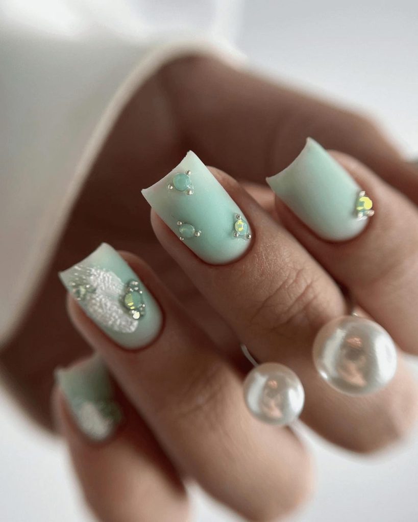 If you want to recreate this at home, precision is key. Apply a smooth mint gel base and cure it properly before adding your embellishments. Use a nail adhesive or gel glue to secure each crystal, placing them strategically for a balanced effect. The finishing step is a protective gel top coat to lock everything in place. The result is a chic and refreshing manicure that’s as stylish as a summer sorbet.