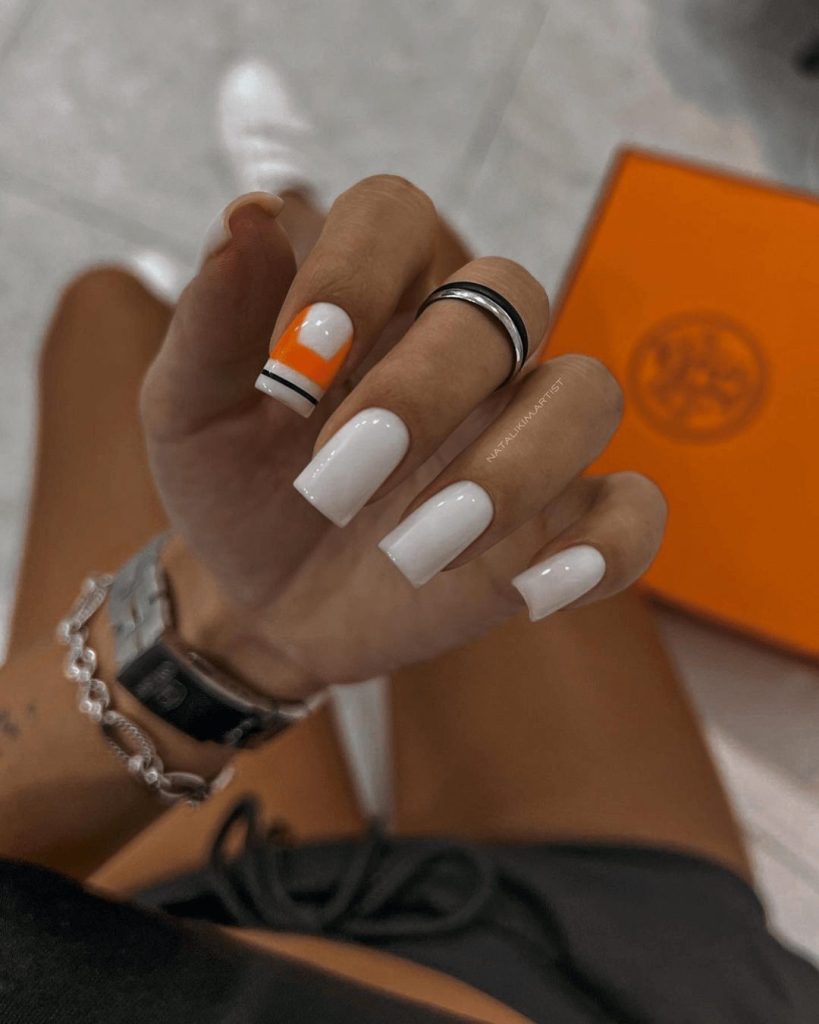 Recreating this look is all about sharp lines. Apply your white gel base and cure it fully, then use striping tape to block off the section where you want the orange stripe. Paint over, peel away the tape, and cure again for that crisp finish. Seal it with a glossy gel top coat, and you’ll have nails that strike the perfect balance between subtle and bold.