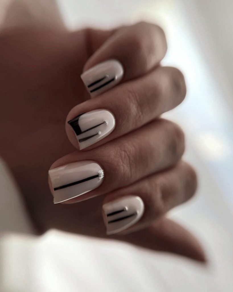 Monochrome has always been fashionable, and this nail look takes it to a new level. Medium square nails are painted in a clean white base with sleek black stripes for contrast. A single crystal accent adds just the right touch of sparkle, transforming simple lines into chic elegance.