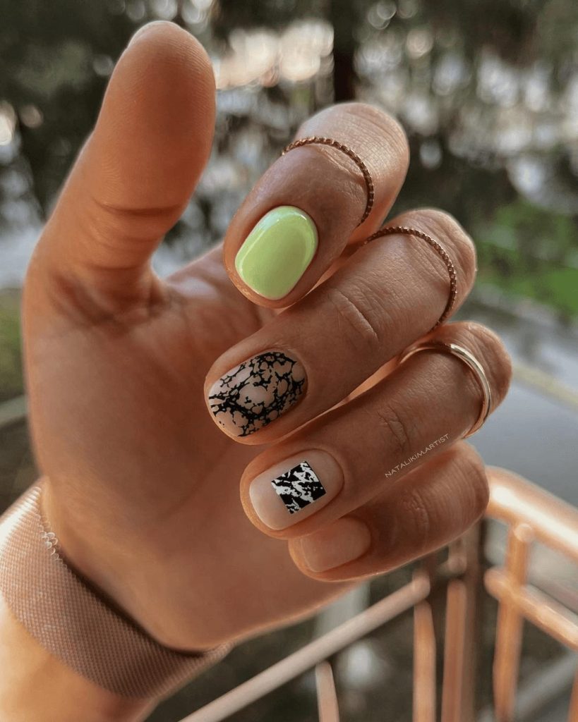 Nature-inspired nails are always calming, and this design brings earthy beauty to your fingertips. A marbled nude and white effect creates the look of natural stone, while one nail is painted in soft green for an accent that feels organic and refreshing. The result is both sophisticated and grounding, perfect for everyday wear.