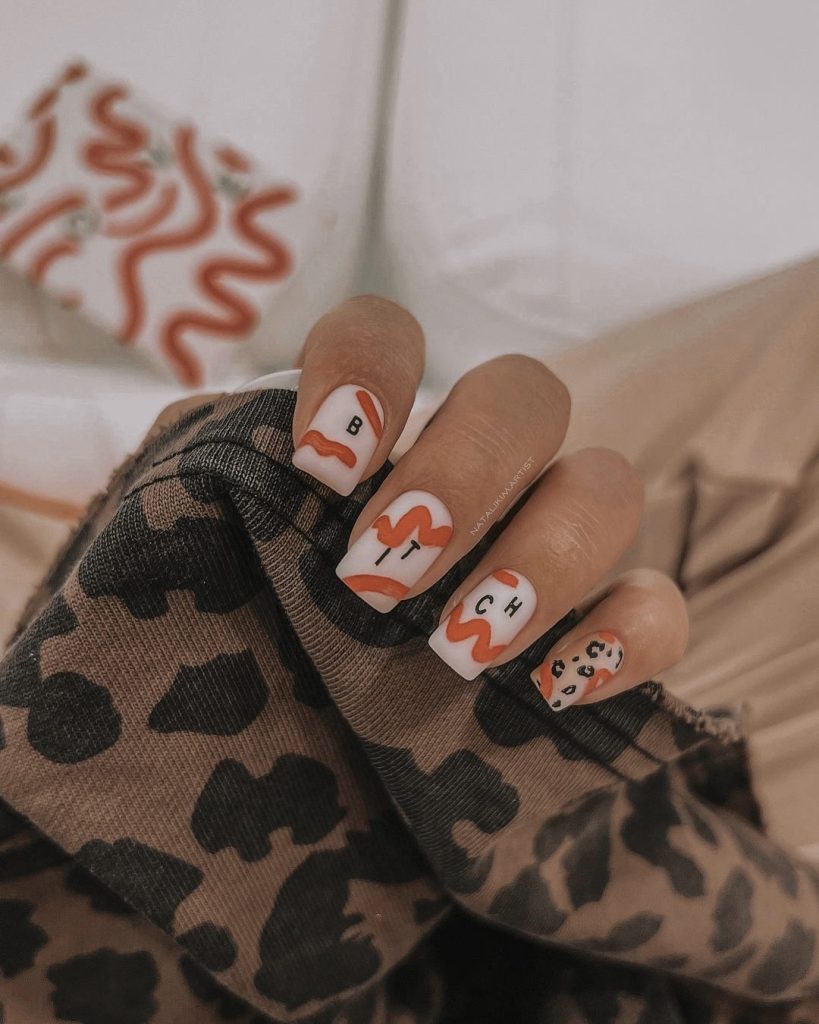 If you love fun and conversation-starting designs, pop art nails are a perfect choice. These short square nails use a crisp white base as a backdrop for bright orange and bold black details. The playful shapes and contrasting colors create a miniature work of art on each fingertip, giving you a vibrant manicure that feels energetic and full of personality.