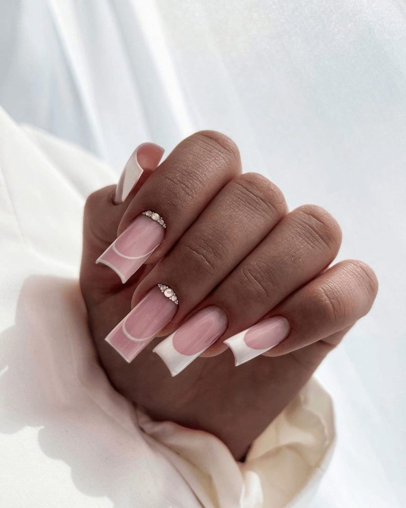 This design shows that minimalism doesn’t mean boring. Short square nails are painted white, then detailed with geometric pink accents and small rhinestones. The clean lines and subtle sparkle give the manicure a fresh, stylish appeal while staying simple enough for everyday wear.