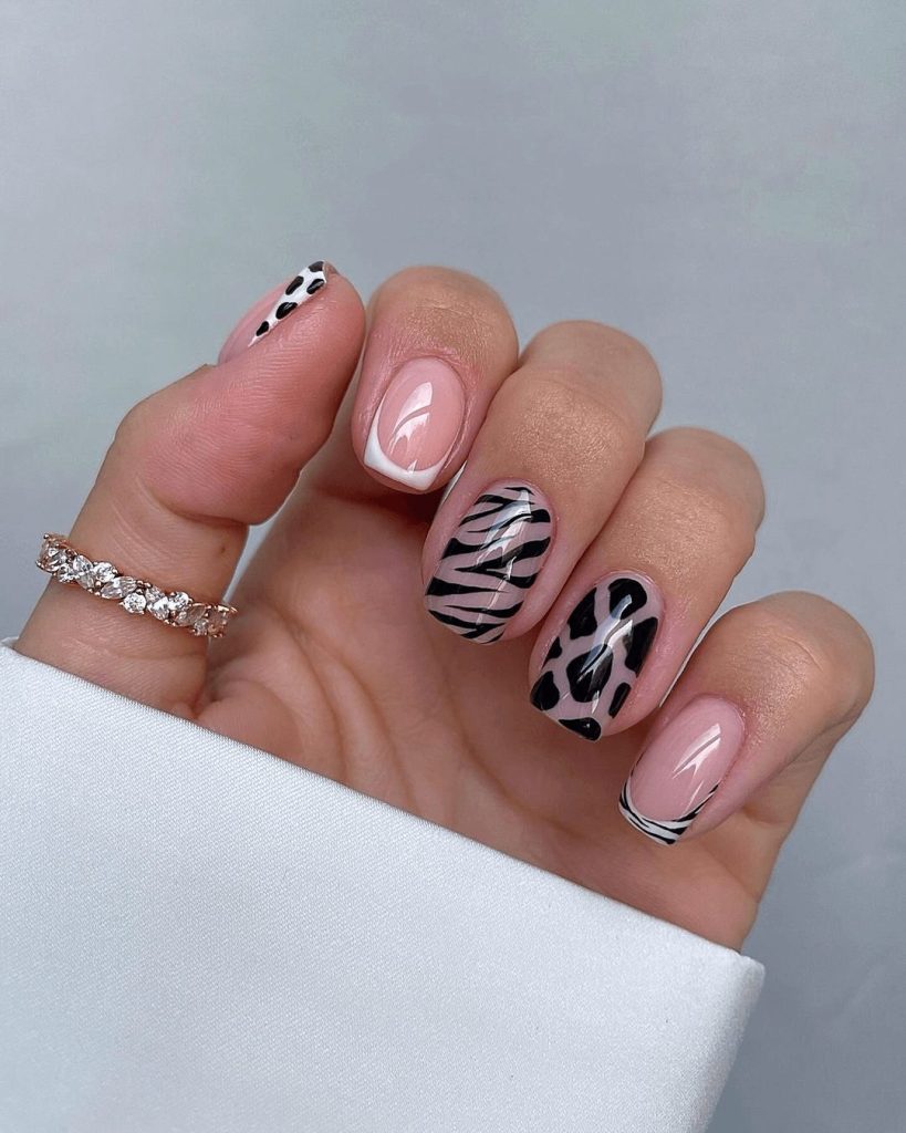 Finding the right balance between elegance and boldness has always been a challenge, but this design makes it easy. The base uses delicate light pink tones mixed with a soft baby blue, creating a polished background for striking animal patterns. Black zebra stripes and leopard spots are layered across the nails to add an edgy, playful twist. The mix of gentle pastels with daring accents makes this look stylish without being over the top.