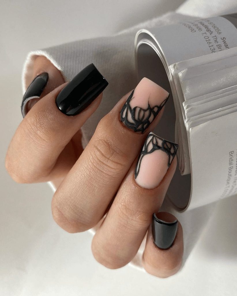 To achieve this, start with a blush-toned gel base. Then, using a fine art brush, carefully draw the web designs on selected nails. The key is precision—thin, delicate lines are what make this design elegant rather than overwhelming. A glossy gel top coat not only protects the artwork but also gives it a high-shine finish that enhances the dark yet beautiful aesthetic.