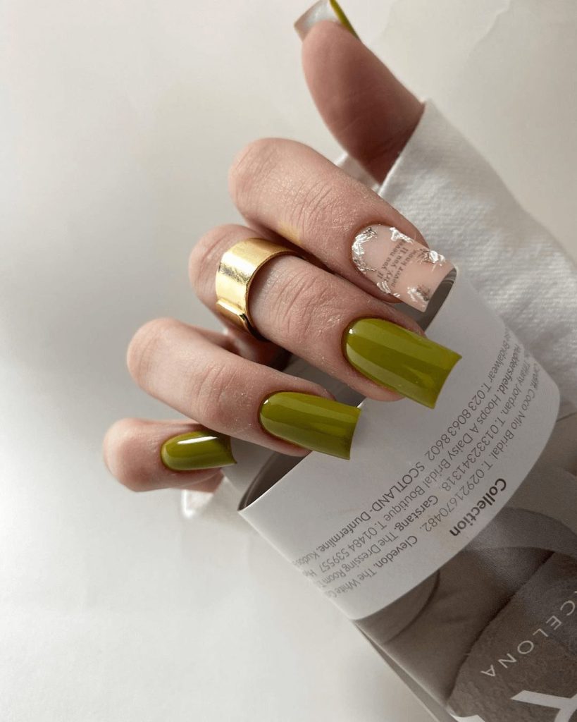 To recreate this, start with a solid green gel polish. Once cured, carefully apply gold leaf pieces or metallic decals for a shimmering accent. Tweezers can help you place each piece with precision. A glossy gel top coat will seal everything and add a polished finish. This bold mix of green and gold is the ultimate statement manicure for the season.
