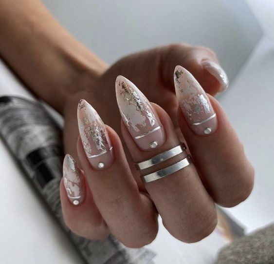 Long almond nails become a luxurious canvas with abstract marble detailing. Blended tones of nude and white create a fluid, artistic effect, while pearl touches and silver foil add an air of high-end glamour. This elegant look complements formalwear and minimalist summer fashion, perfect for weddings, evening galas, or professional settings that call for understated beauty.
