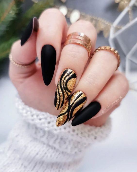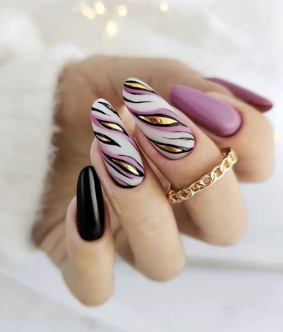 Bold meets glamorous in this daring almond nail design. Zebra stripes in black and white race across a nude or neutral base, while shimmering gold foil adds a luxe accent that elevates the look. This nail art creates the perfect balance of edgy and refined, making it ideal for a bold night out, a summer concert, or an upscale fashion event. Pair it with a sleek dress or bold patterns to enhance the wild sophistication.