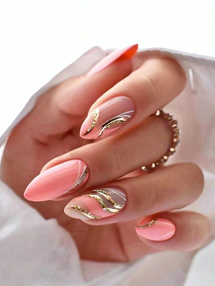 A soft ombre from pink to coral makes this French tip-inspired design effortlessly radiant. Gold swirls add a luxurious touch, giving these nails an elegant flair. Ideal for bridal events, summer soirées, or classy garden parties, this design works beautifully with floral prints, soft linens, or monochrome pieces.