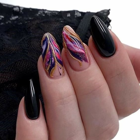 These long almond nails feature a glossy black base adorned with colorful art strokes and gold foil for a dramatic, expressive look. Perfect for creative spirits and bold personalities, this style works well with edgy ensembles, artistic prints, or sleek eveningwear.