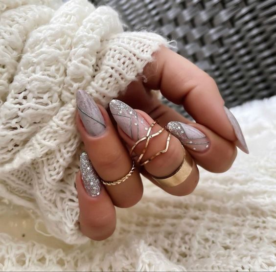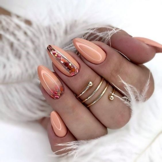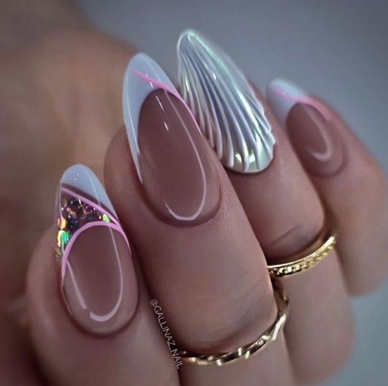 Natural hues like beige, taupe, and warm browns meet shimmering lines and glitter in this earthy almond nail design. It’s a go-to for those who love minimal tones but still want a hint of sparkle. This look complements gold jewelry and is easy to pair with everything from summer workwear to weekend wear.