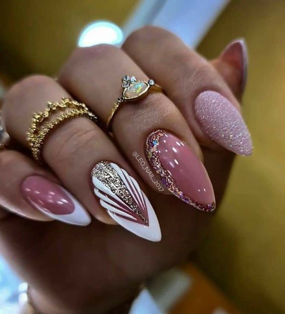 This romantic pink nail design is both dreamy and dazzling. Medium-length almond nails feature shimmering glitter and soft white accents that form a contemporary twist on French tips. Ideal for summer weddings, garden parties, or special celebrations, these nails add sparkle and femininity to any dressy outfit.