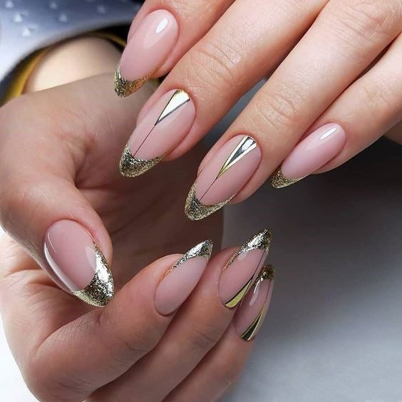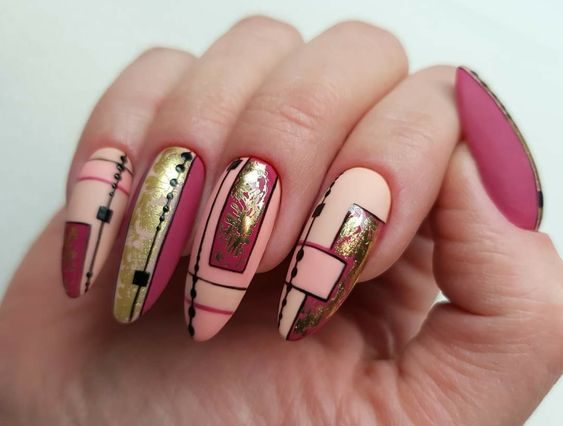 Geometry becomes glam in this polished look. Thin metallic gold lines stretch across a medium pink base, forming clean, angular designs that sparkle with every move. These nails offer a simple, structured sophistication and are ideal for women who appreciate minimalism with flair. Wear them with tailored blazers, co-ords, or solid color dresses for an upscale feel.