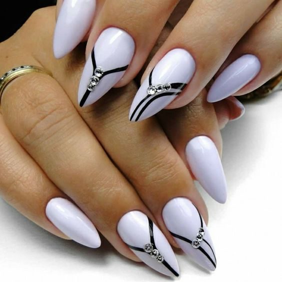 Serenity meets style in this tranquil lavender nail design. Long almond nails are accented with sleek black lines and glimmering silver gems, turning a classic French tip into a dreamy, artistic masterpiece. These nails are versatile—fit for both everyday glam and special occasions. They’re a lovely match for soft fabrics, romantic silhouettes, and relaxed summer elegance.