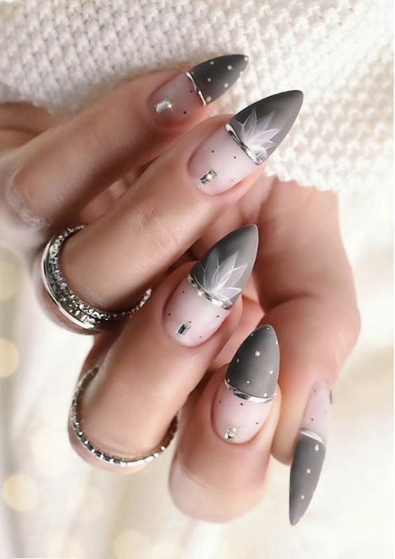 Long almond nails in grey tones get a natural refresh with white leaf motifs. This monochromatic design merges urban sophistication with organic inspiration. It’s a great match for earthy outfits, minimalist fashion, and chic neutral tones, giving a polished look that transitions seamlessly from work to weekend.