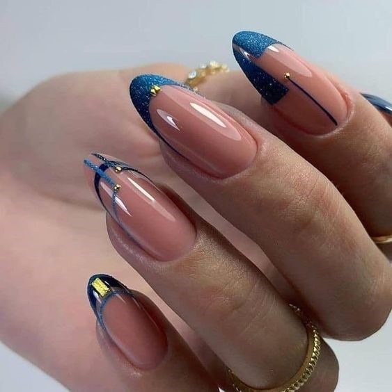 Elevate your summer manicure with a reimagined French tip in navy and gold. The deep blue base brings a touch of mystery, while gold glitter and tiny studs offer celestial flair. This trendy and timeless look pairs beautifully with evening wear, seaside dinners, or formal events. Sophisticated yet radiant, it’s a perfect match for the woman who shines without effort.