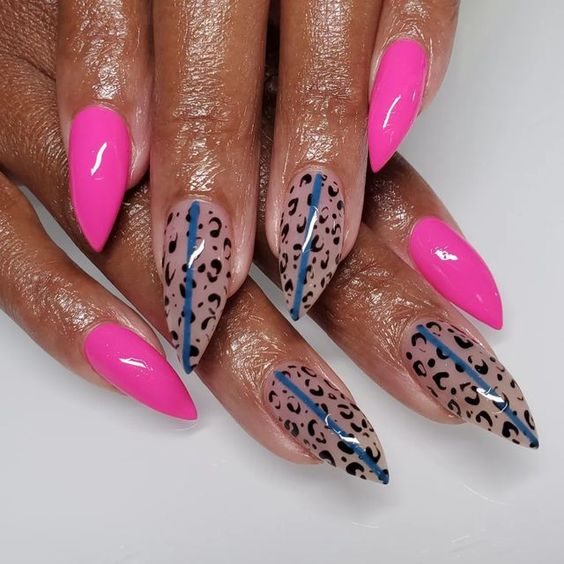 When bold neon colors meet wild animal prints, the result is fierce and unforgettable. Bright pink and blue shades lay the foundation for a playful leopard print overlay, creating a confident baddie aesthetic. These long almond nails are perfect for trendsetters who embrace high-impact fashion. Wear with vibrant summer outfits or edgy monochrome sets for a standout look.