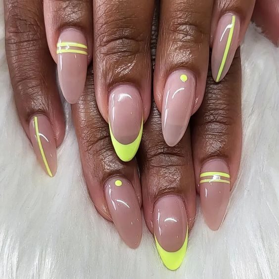 Simple meets daring with this neon-and-nude combo. Nude almond nails are given a trendy boost with pops of neon yellow at the tips and around the cuticle. The design is perfect for fashion-forward individuals who like to turn heads. Style it with denim, neon accents, or crisp whites for a bold summer look.