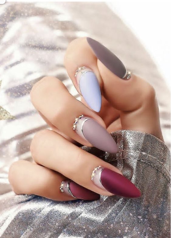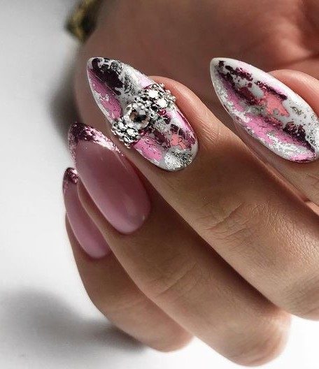 A soft pink base splashed with metallic silver creates a playful, artistic vibe. The 3D jewel detail adds sophistication without going over the top. These trendy almond nails pair well with both pastel tones and bolder evening looks, adding a whimsical yet classy touch to your outfit.